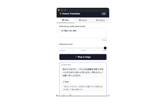 Honne Translator는 사용자가 일본 비즈니스 커뮤니케이션의 복잡성을 탐색하는 데 도움을 주기 위해 설계된 Chrome 추가 기능입니다. 이 무료 도구는 공손한 일본어 표현 뒤에 숨겨진 의미를 해독하여 사용자가 공식 언어(tatemae) 뒤에 있는 진정한 의도(honne)를 이해할 수 있도록 합니다. Decode Mode와 같은 기능을 통해 사용자는 일본어 문장을 붙여넣어 그 기본 의미와 진정성 점수, 문화적 맥락을 드러내어 다양한 사회적 상황에서 정확한 해석을 보장합니다.